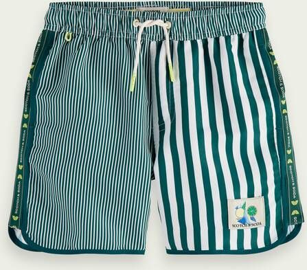 Scotch & Soda Zwembroek met strepenmix./h3#Of je nu naar het strand gaat of het zwembad, deze trendy zwembroek is er klaar voor. Hij valt meteen op met een mix van verschillende strepen en tapedetails over de zijkanten. Je kunt ook makkelijk de pasvorm perfect afstellen met het trekkoord in de elastische taille.Scotch & Soda Groene Mid Lenght Sporty Swim Shorts